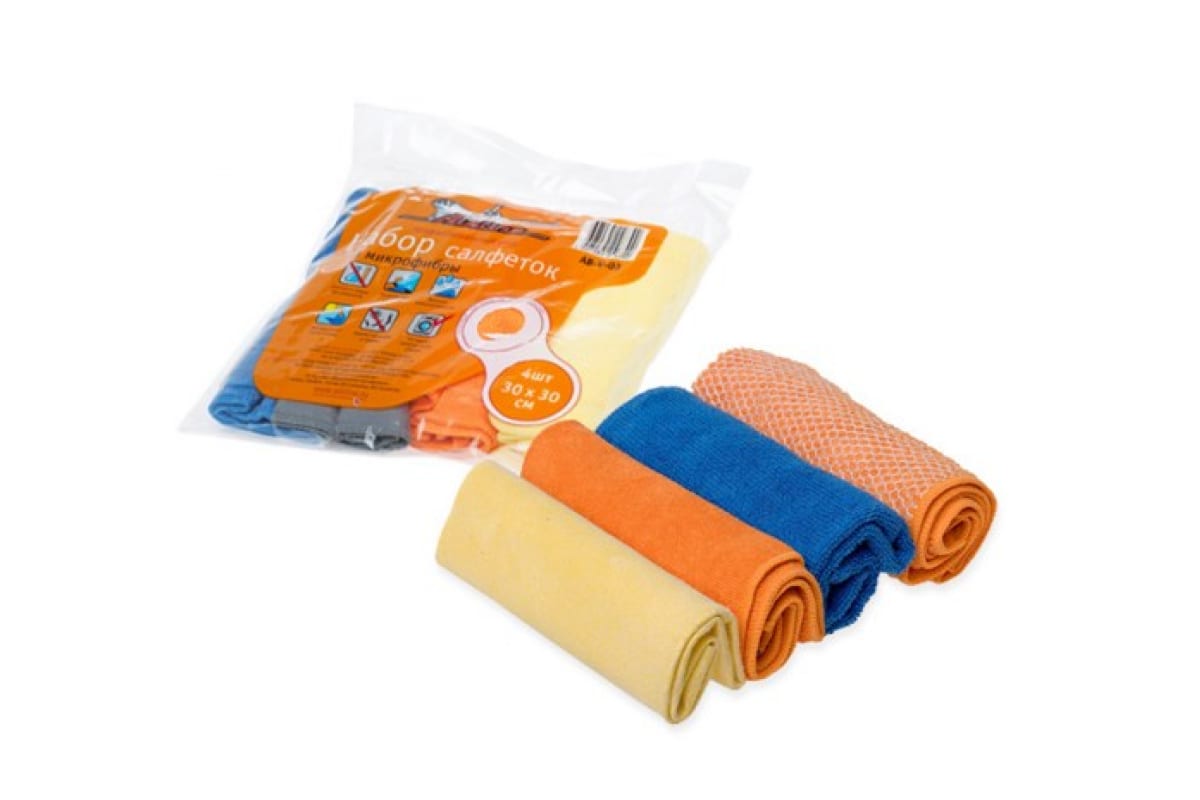 Набор салфеток из микрофибры (рулончики, 4 шт, 30х30 см) Airline AB-V-03 используется для влажной и сухой уборки, а также полировки стеклянных и окрашенных поверхностей автомобиля. Отличительной чертой микрофибры является ее способность впитывать большой объем жидкости. В комплекте 3 салфетки плотностью 300 г/м2 и 1 салфетка - 200 г/м2.