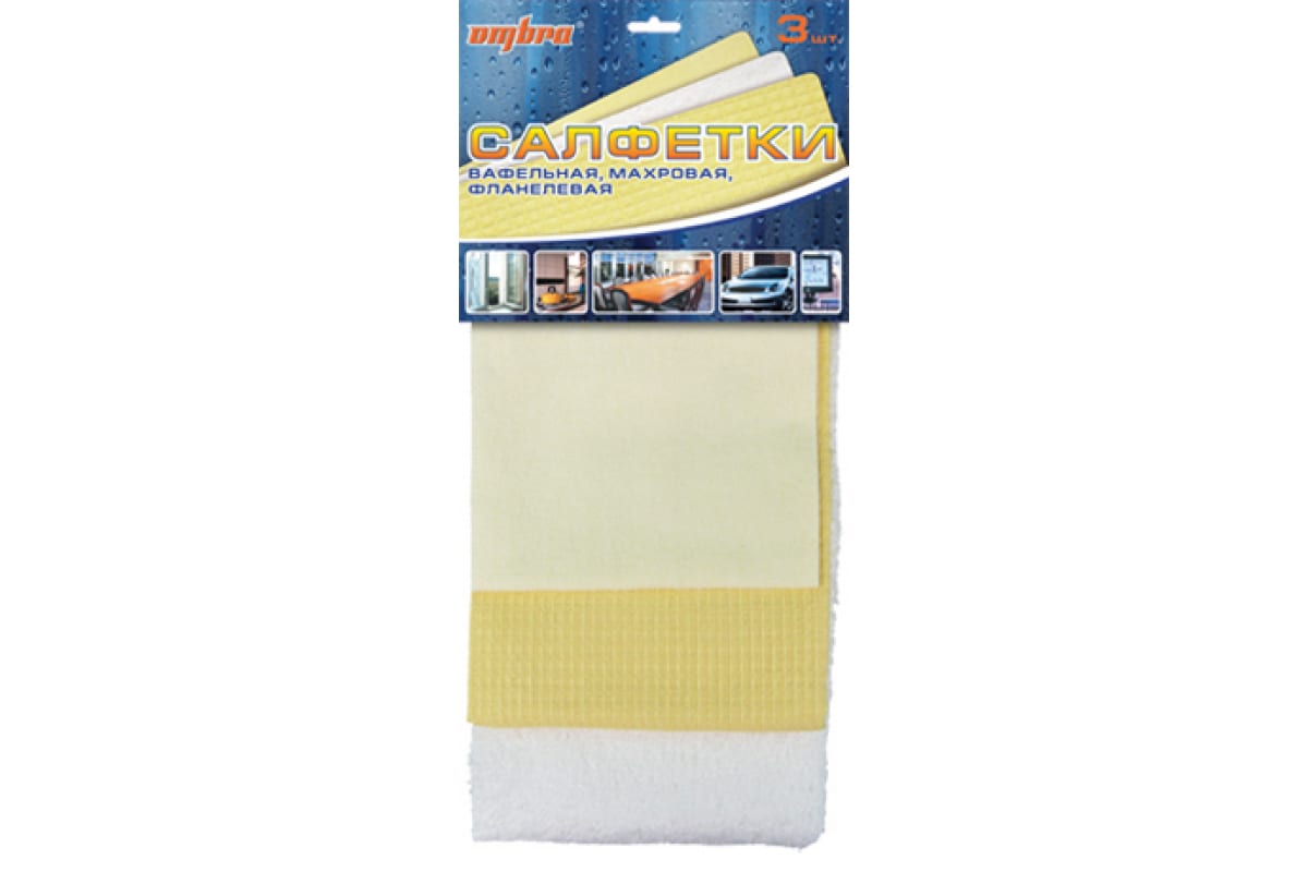 Набор салфеток OMBRA ПР-10 предназначен для чистки и мойки автомобиля. Включает в себя 3 салфетки: вафельную, махровую и фланелевую. Вафельная салфетка 37х37 см используется для протирания машины после мойки или для удаления пыли. Махровая салфетка 39х39 см также может использоваться для вытирания пыли или для нанесения автокосметики и дальнейшей ее располировки на поверхности автомобиля. Фланелевая салфетка 25х29 см в основном применяется для полировки. Пользователь может сам подобрать наиболее подходящую салфетку для необходимой работы. Сочетая три разных материала при уходе за своим авто, можно добиться его идеальной чистоты.