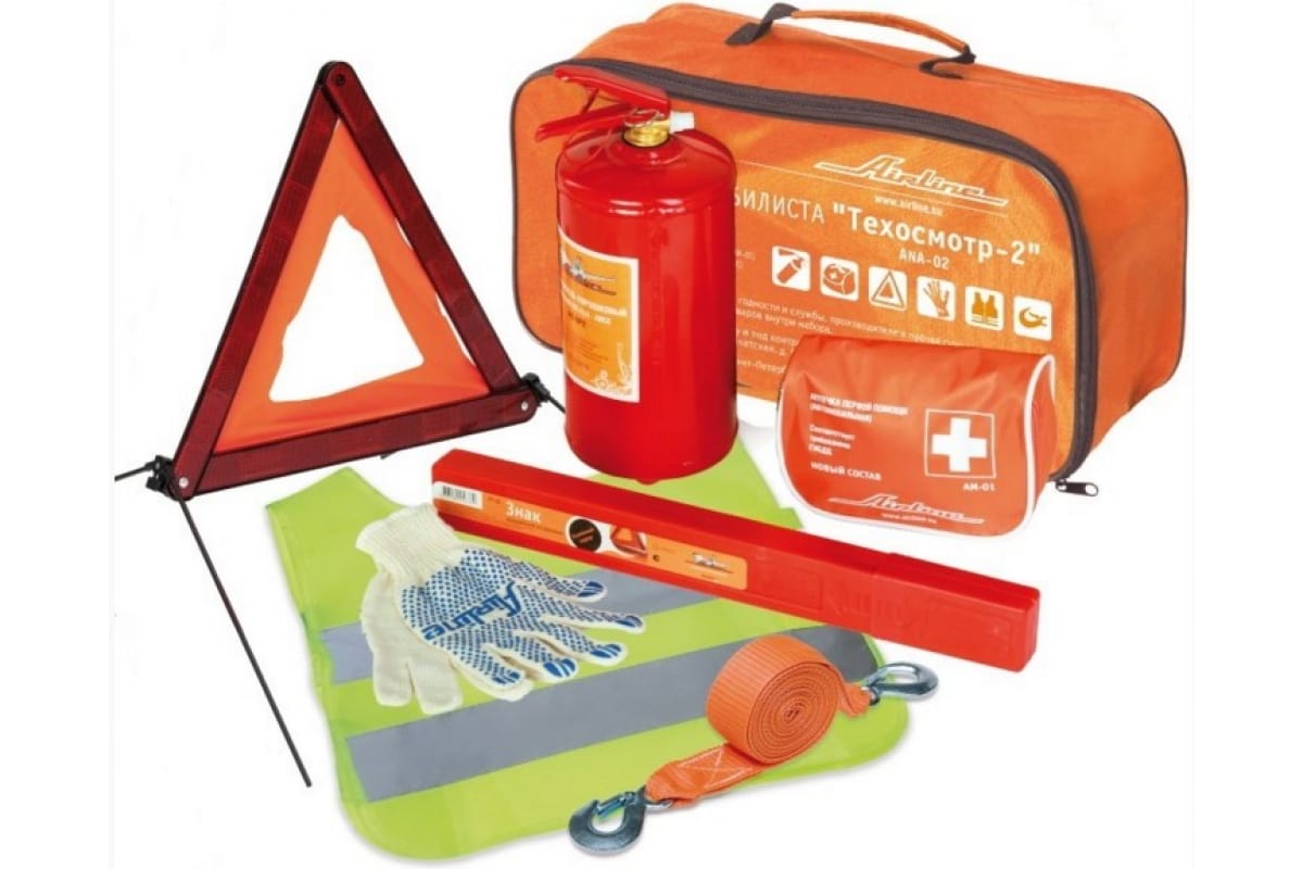 Набор автомобилиста Airline Техосмотр-2 ANA-02 отличается расширенной комплектацией и включает в себя все необходимое для разрешения аварийной ситуации на дороге: трос для вытягивания застрявшего автомобиля, огнетушитель для оперативного устранения возгораний, знак для обозначения остановки и прочее. Также комплект позволяет проходить технический осмотр транспортного средства.