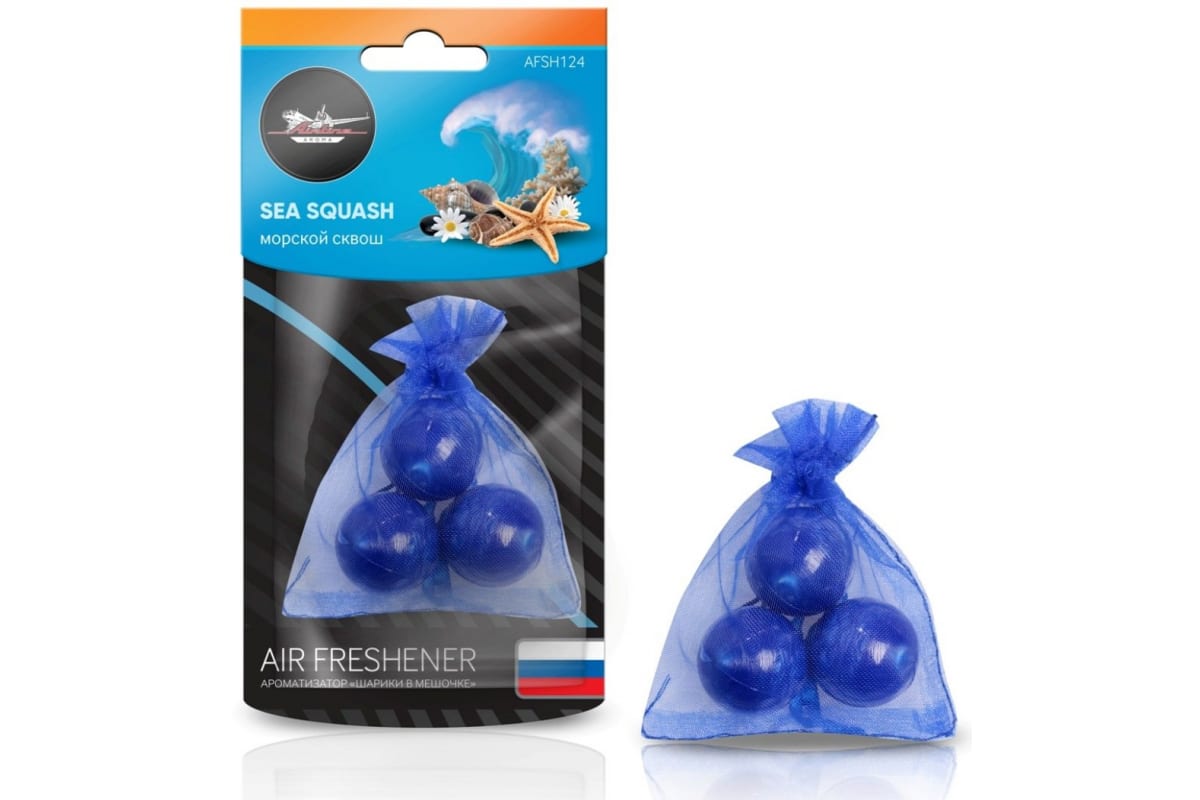 Ароматизатор Airline Шарики в мешочке, морской сквош AFSH124 подарит ощущение свежести и чистоты. Выполнен из качественного полимера, в состав которого введена отдушка. Благодаря такой технологии изделие позволит долго наслаждаться ароматом.