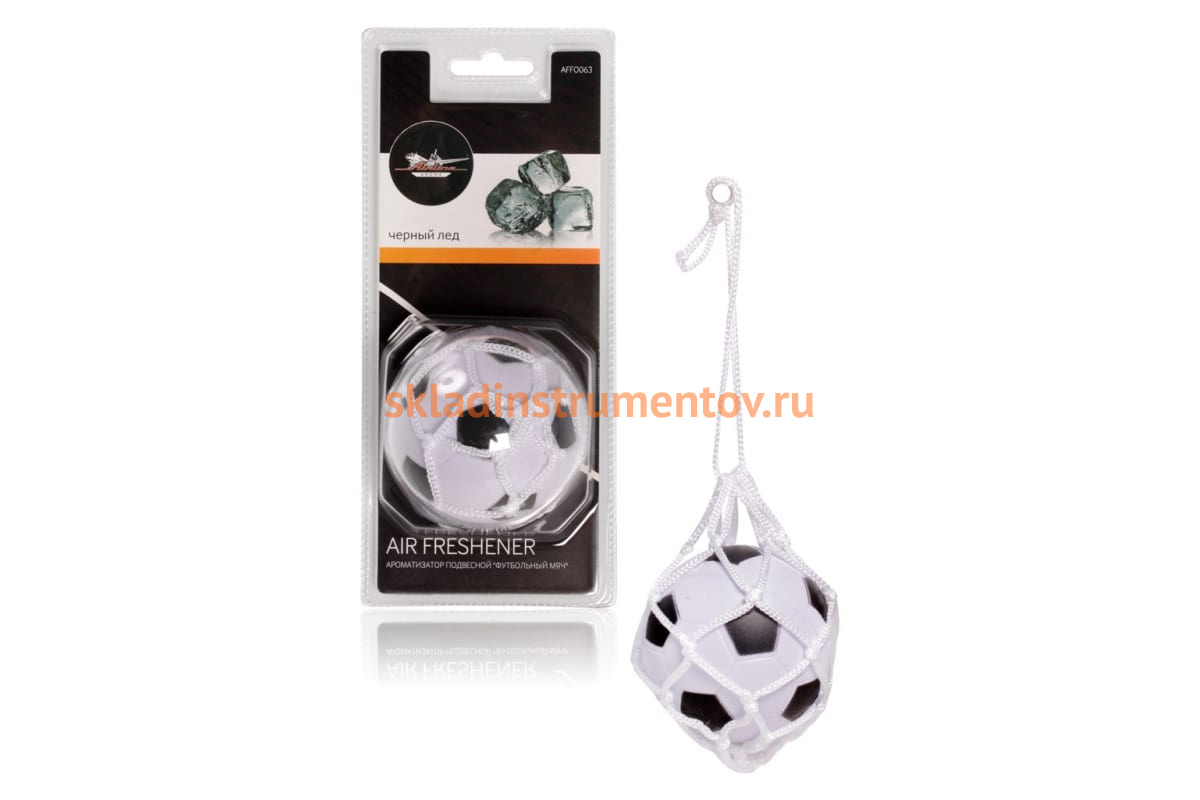Подвесной ароматизатор Airline Футбольный мяч черный лед AFFO063 используется для свежести воздуха в салоне автомобиля. Аксессуар изготовлен в форме футбольного мяча и крепится к обзорному стеклу с помощью компактной веревки.