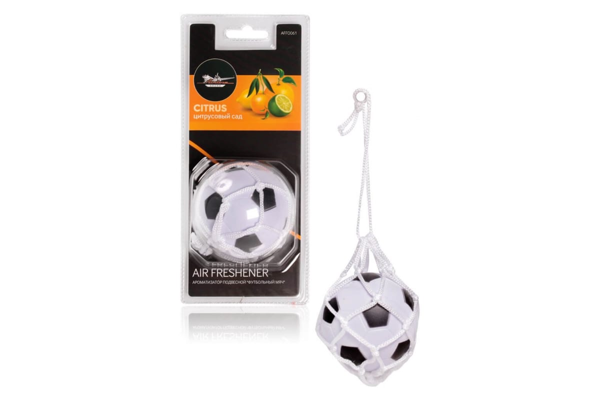Подвесной ароматизатор Airline Футбольный мяч цитрусовый сад AFFO061 используется для свежести воздуха в салоне автомобиля. Аксессуар изготовлен в форме футбольного мяча и крепится к обзорному стеклу с помощью компактной веревки.