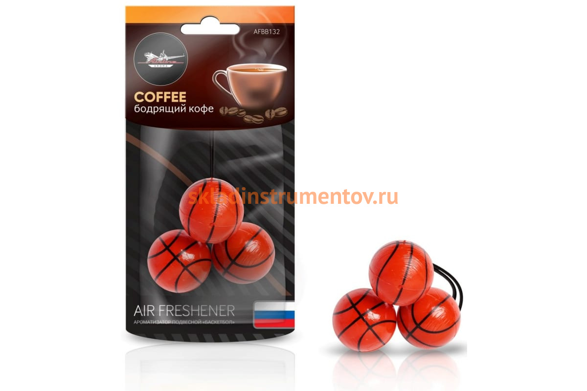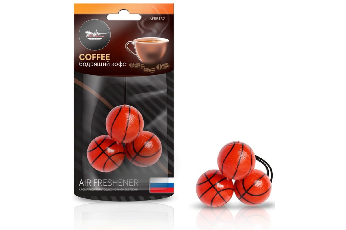 Подвесной ароматизатор Airline Баскетбол бодрящий кофе AFBB132 освежает запах в салоне автомобиля.