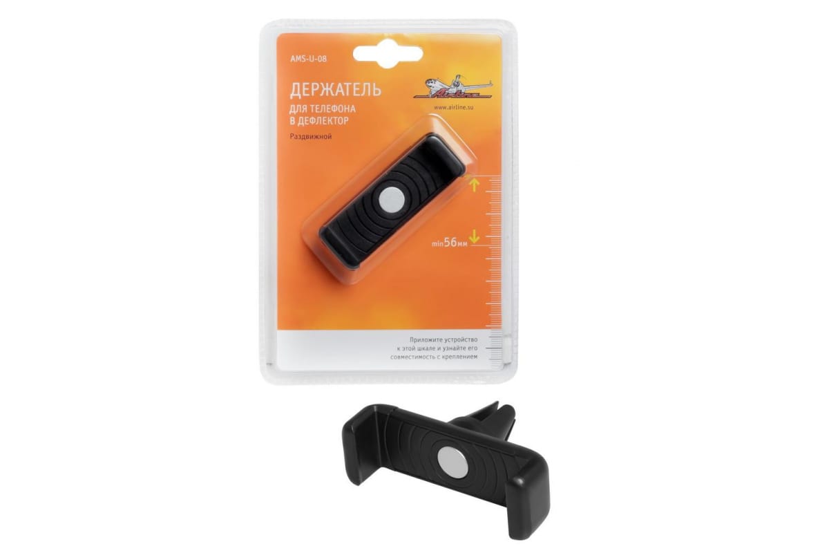 Раздвижной держатель для телефона в дефлектор Airline AMS-U-08 предназначается для удержания мобильного телефона, КПК других гаджетов. Устройство регулируется по ширине от 58 до 86 мм. Оснащается прорезиненным креплением, которое надежно удерживает модель в дефлекторе автомобиля.
