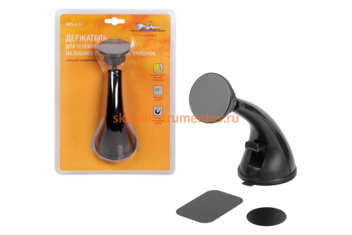 Магнитный держатель для телефона Airline AMS-U-14 крепится на лобовое стекло или приборную панель автомобиля с помощью присоски-липучки. Мощный неодимовый магнит надежно удерживает телефон. Держатель может вращаться на 360 градусов.