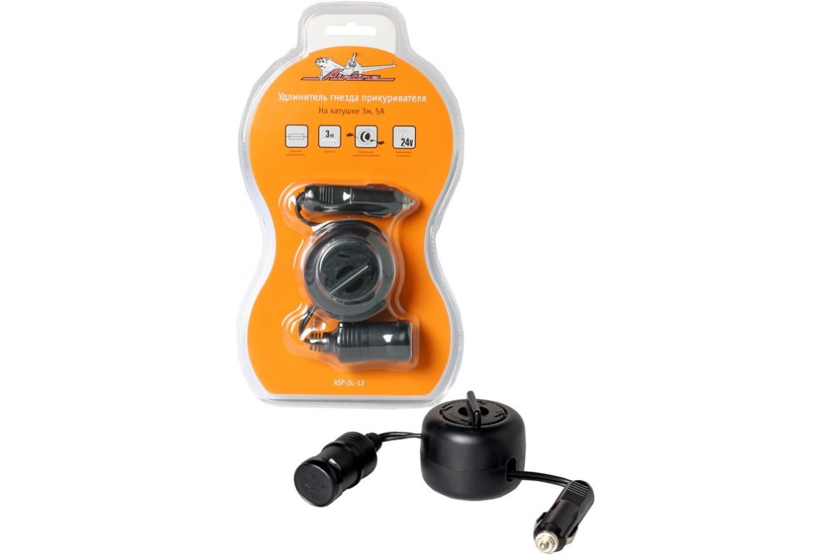 Прикуриватель-удлинитель на катушке 3м, 5А Airline ASP-3L-13 используется для подключения различных устройств, таких как: мобильные телефоны, з/у для ноутбуков, радар-детекторы, видеорегистраторы и т.д. Питание производится бортовой сети автомобиля 12 В. Длина шнура составляет 3 метра. Шнур легко сматывается в катушку для компактного хранения и предотвращения его спутывания.