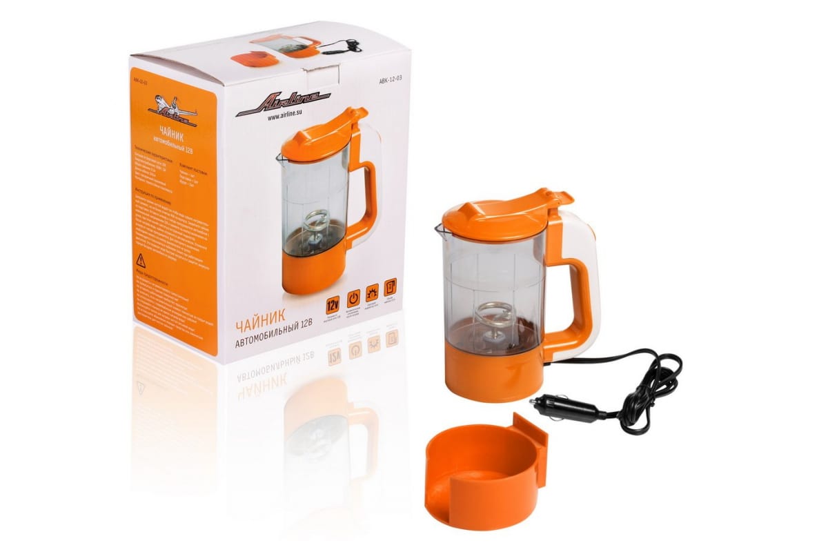 Автомобильный чайник Airline 12В прозрачный/оранжевый ABK-12-03 поможет нагреть воду для приготовления чая, кофе или пищи. Работает от автомобильного прикуривателя.
