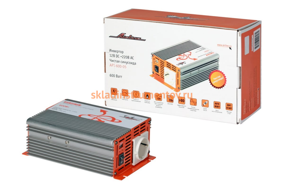 Инвертор Airline API-600-05 позволяет осуществлять питание чувствительной электроники - это стало возможно за счет чистой синусоидной формы выходного сигнала. Данная модель надежно защищена от перегрева, скачков напряжения, а также перегрузок. Преимуществом преобразователя является то, что при устранении неполадок, приводящих в действии защиту, устройство возобновляет работу автоматически. Максимальная суммарная мощность подключаемых потребителей - 600 Вт.