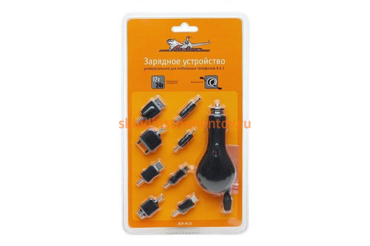 Зарядное устройство для мобильных устройств 8в1 Airline ACH-M-01 служит для зарядки мобильных телефонов Nokia (2 типа), Motorola (2 типа), Samsung (типа D808), Siemens (типа C55), Sony-Ericsson (типа K750), LG, mini USB от бортовой сети автомобиля (12/24В). Изделие оснащено удобной конструкцией - питающий шнур сматывается внутрь корпуса по принципу рулетки.