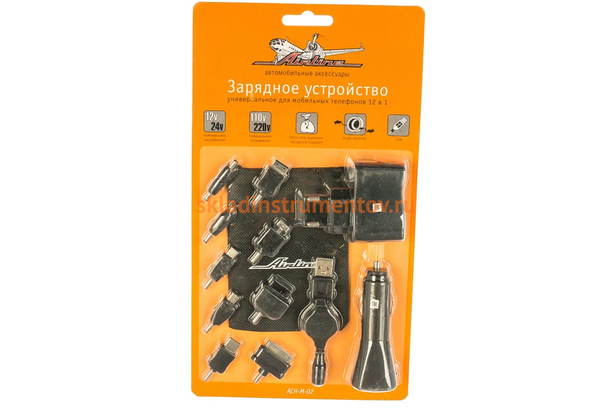 Зарядное устройство для мобильных устройств 17в1 Airline ACH-M-02 имеет выходной ток 500 мА. Используется для подключения к гнезду прикуривателя автомобиля (12/24В), сети 110-240В, USB. Служит для зарядки мобильных телефонов Nokia (2 типа), Motorola (4 типа), Samsung (2 типа), Siemens (типа C55), Sony-Ericsson (типа K750), LG, mini USB, MP3 плееры, Black Berry, iPod/iPhone. Удобная сматывающаяся конструкция работает по принципу рулетки.