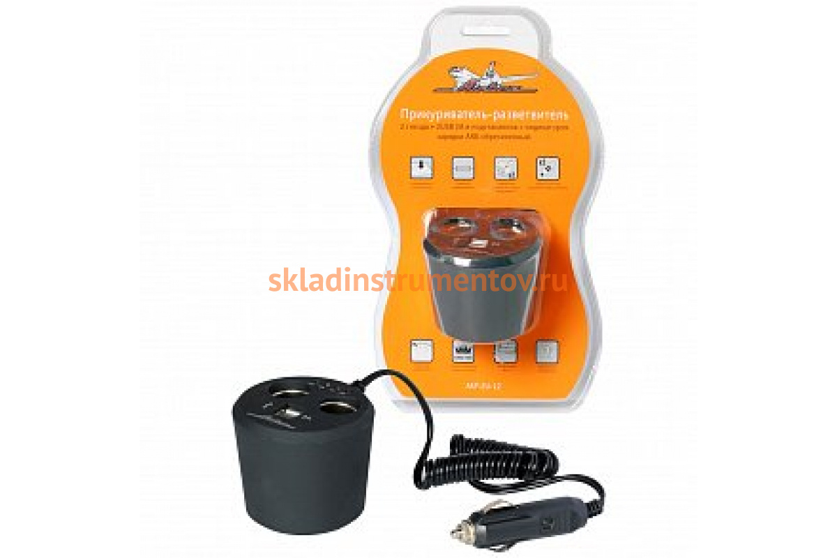 —Прикуриватель-разветвитель Airline 2 гнезда + 2USB в подстаканник с индикатором зарядки АКБ обрезиненый ASP-2U-12—