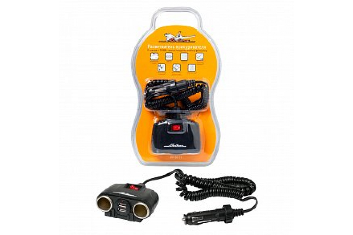 —Прикуриватель-разветвитель Airline 2 гнезда + 2USB с витым шнуром, штекер-фиксатор ASP-2U-11