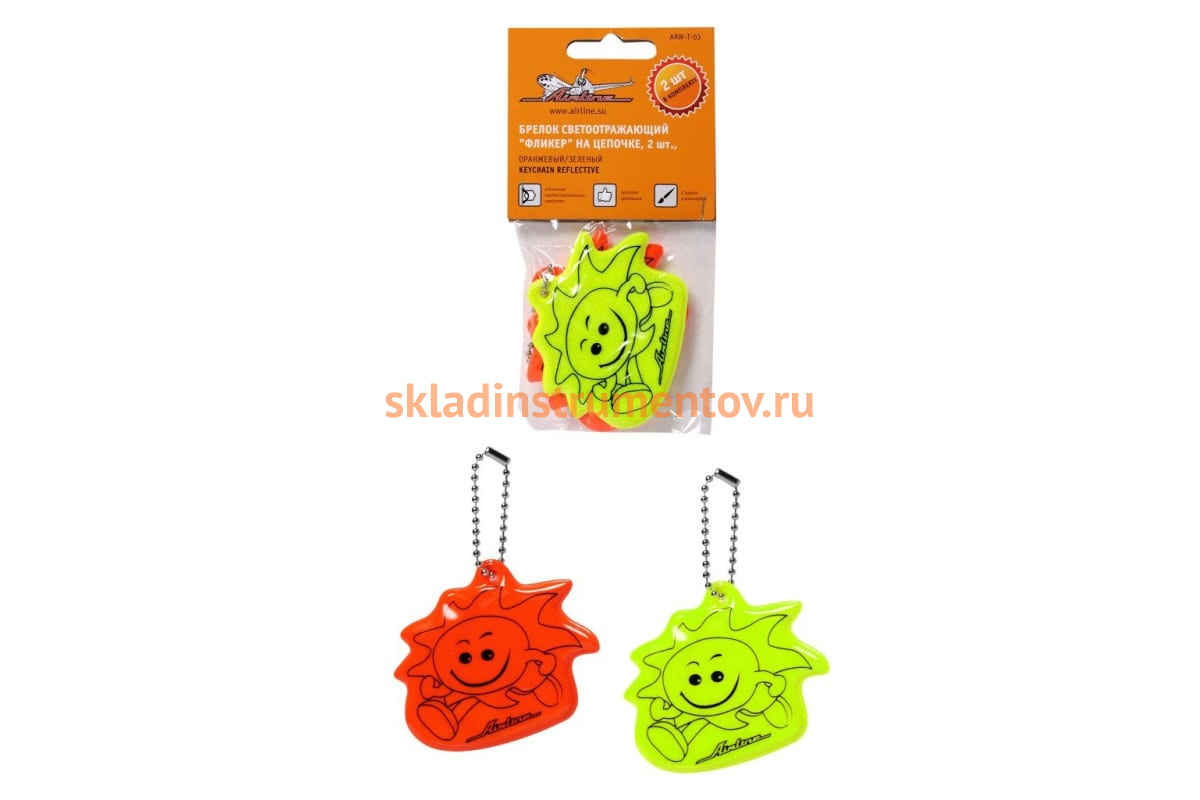 Светоотражающий брелок Airline Фликер 2 шт. ARW-T-03 крепится на одежду или другие предметы для лучшей видимости в темное время суток. Имеет двусторонний рисунок и световозвращающее покрытие. В комплекте 2 брелка оранжевого и зеленого цвета.