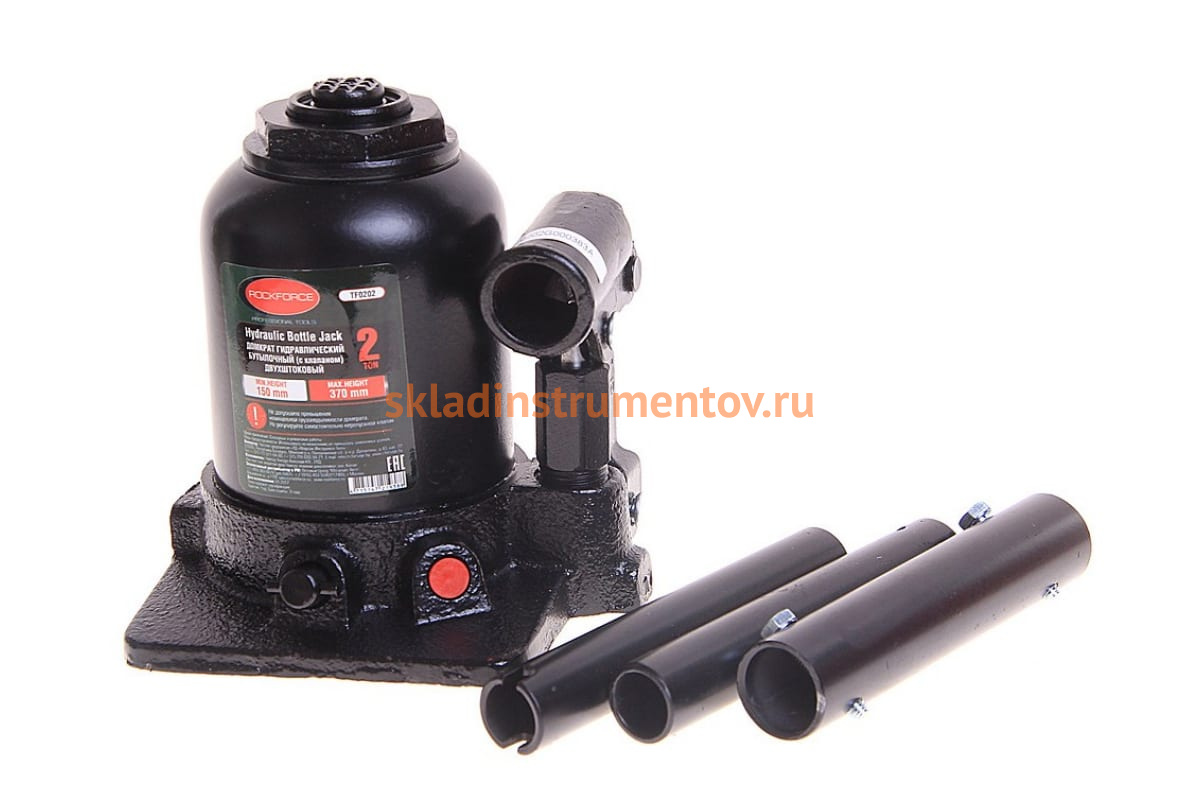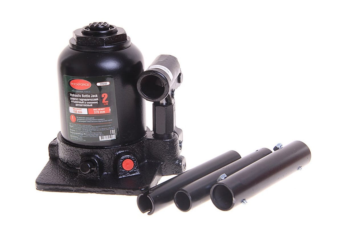 Гидравлический бутылочный домкрат с двумя штоками и клапаном ROCKFORCE 2т выс. подъема 150-370мм RO RF-TF0202 надежное устройство для автосервиса или частной мастерской. Модель предназначена для подъема автомобиля на высоту до 370 мм.