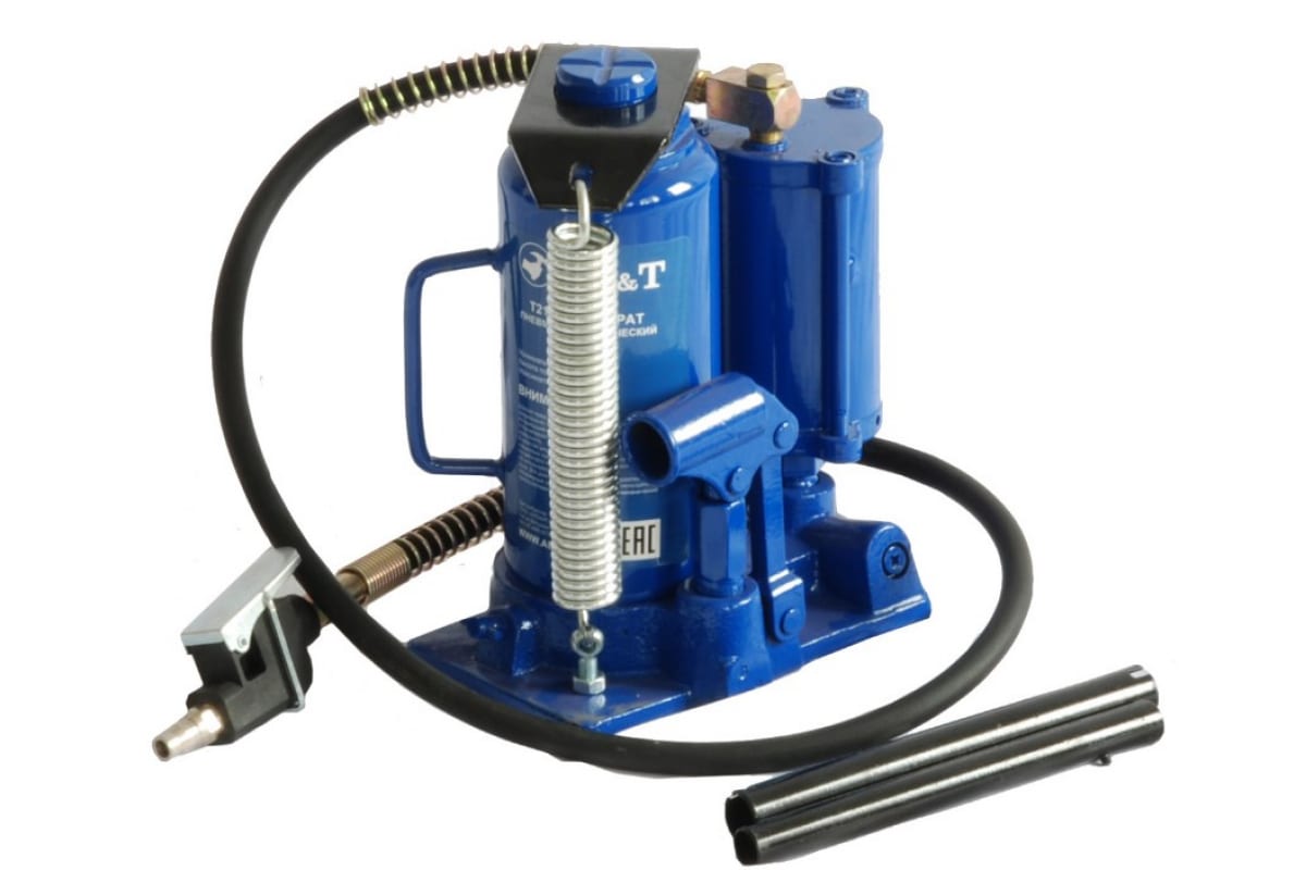 Пневмогидравлический бутылочный домкрат AE&T Т21012 предназначается для подъема тяжелой техники - грузовиков, автобусов и прочего крупного автотранспорта. Съемный рычаг способствует простоте хранения и транспортировки домкрата. Для удобства перемещения модели на корпусе предусматривается рукоять. Оптимальное рабочее давление воздуха - менее 8 бар.