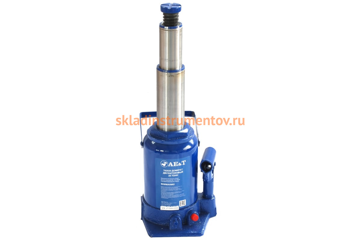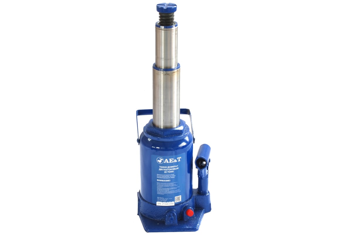 Бутылочный двухштоковый домкрат 20т AE&T T02020 характеризуется самой большой высотой подъема в своей серии - 485 мм. Данная модель относится к профессиональному классу автогаражного оборудования, широко применяется на станциях ТО, в шиномонтажных мастерских и автосервисах. Использование двух штоков в конструкции обеспечило компактность домкрата. Наличие предохранительного клапана предотвращает домкрат от поломки вследствие перегрузки.