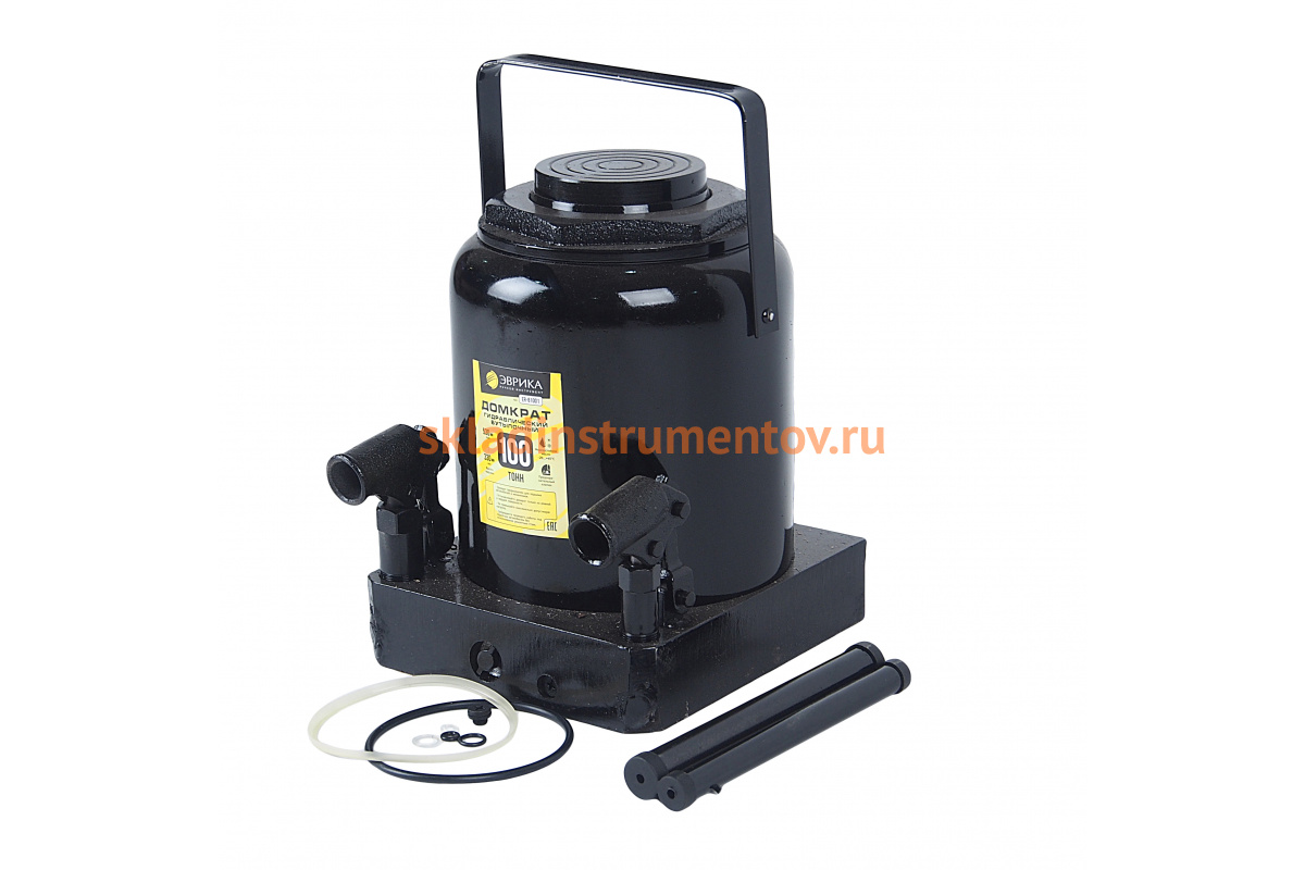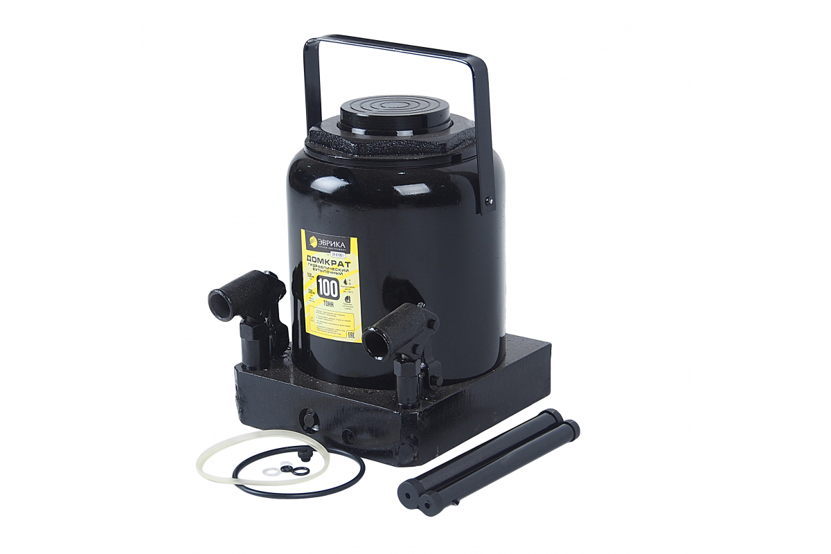Гидравлический бутылочный домкрат ЭВРИКА с клапаном, 100 т, ремкомплект ER-81001 предназначен для подъема транспорта и других тяжелых грузов на высоту до 530 мм. Модель обладает сверхпрочным корпусом и надежным механизмом, что обеспечивает максимальную грузоподъемность в 100 тонн. Домкрат поставляется с удобной рукояткой-рычагом и ремкомплектом. Благодаря использованию морозостойкого масла агрегат разрешается эксплуатировать при температурах до -20ºС.