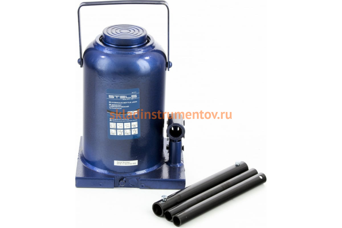 Гидравлический бутылочный домкрат 50 т, h подъема 280–450 мм STELS 51171 обладает высокой прочностью и хорошей грузоподъемностью. В комплекте идет рукоять, состоящая из трех частей, для более удобного подъема.
