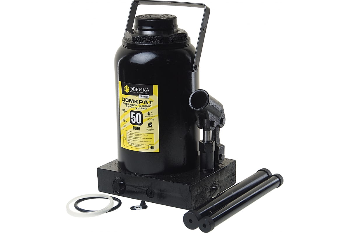 Гидравлический бутылочный домкрат ЭВРИКА с клапаном, 50 т, ремкомплект ER-80501 предназначен для подъема транспорта и других тяжелых грузов на высоту до 500 мм. Модель обладает сверхпрочным корпусом и надежным механизмом, что обеспечивает максимальную грузоподъемность в 50 тонн. Домкрат поставляется с удобной рукояткой-рычагом и ремкомплектом. Благодаря использованию морозостойкого масла агрегат разрешается эксплуатировать при температурах до -20ºС.