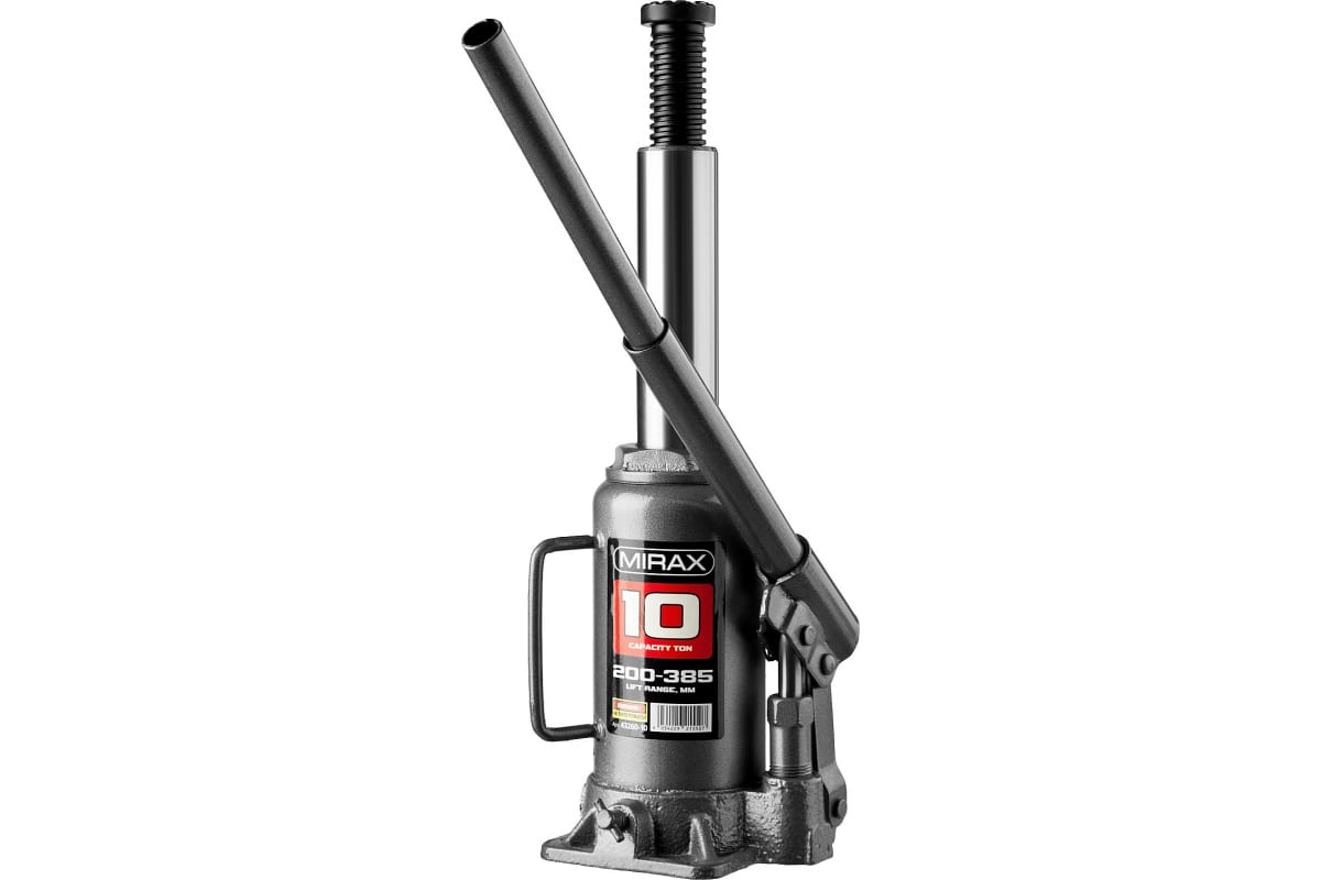 Гидравлический бутылочный домкрат MIRAX 10т, 200-385 мм 43260-10 удобен в автомастерских и при использовании в собственном гараже.