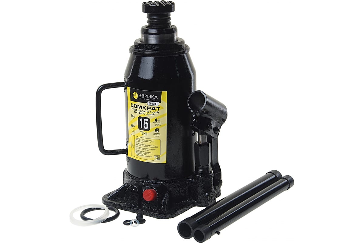Гидравлический бутылочный домкрат ЭВРИКА с клапаном, 15 т, ремкомплект ER-80151 используется для поднятия транспорта при проведении шиномонтажных и ремонтных работ. Обладает внушительной грузоподъемностью, но достаточно компактными габаритами и малым весом. Домкрат прост в эксплуатации, оснащен ручкой для переноски и рукояткой-рычагом для легкого поднятия груза. Модель надежна и долговечна, поставляется с ремкомплектом.