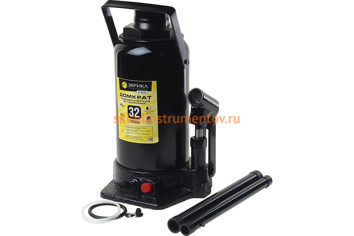 Гидравлический бутылочный домкрат ЭВРИКА с клапаном, 32 т, ремкомплект ER-80302 предназначен для подъема транспорта и других тяжелых грузов на высоту до 465 мм. Модель обладает сверхпрочным корпусом и надежным механизмом, что обеспечивает максимальную грузоподъемность в 32 тонны. Домкрат поставляется с удобной рукояткой-рычагом и ремкомплектом. Благодаря использованию морозостойкого масла агрегат разрешается эксплуатировать при температурах до -20ºС.
