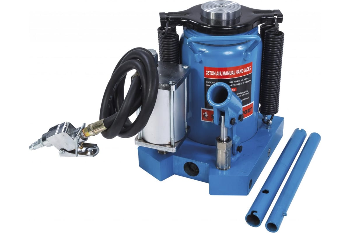 Пневмо-гидравлический бутылочный домкрат на 35 тонн Станкоимпорт SD2003 обладает широкой опорной поверхностью, которая гарантирует устойчивость конструкции. Специальная ручка способствует легкости транспортировки. Порошковое покрытие надежное защищает корпус модели от влияния коррозии.