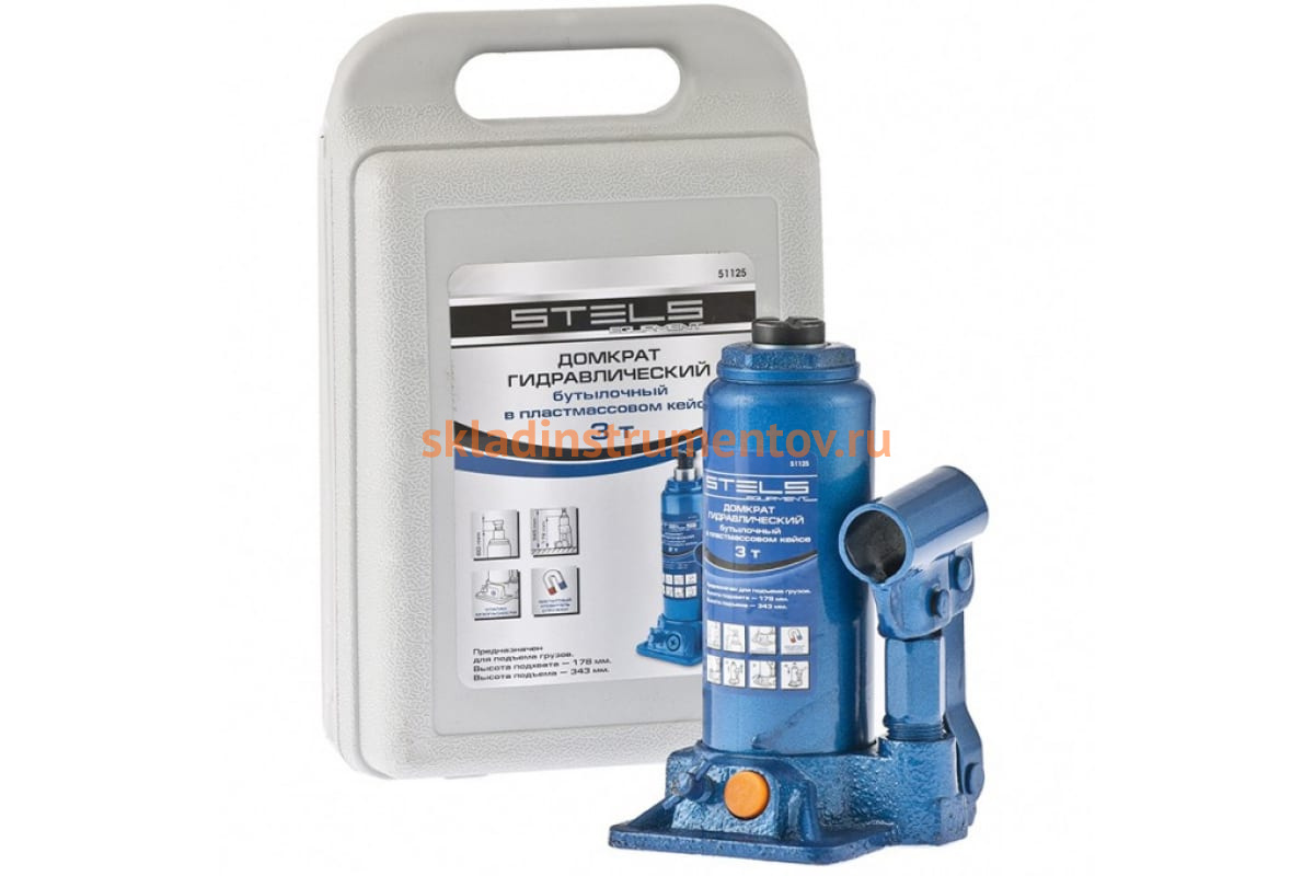 Гидравлический бутылочный домкрат 3 т, h подъема 178–343 мм, в пластиковом кейсе STELS 51125 оснащен специальным магнитом, который исключает появление стружки в масле. Это увеличивает срок службы изделия.