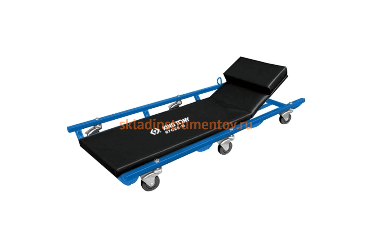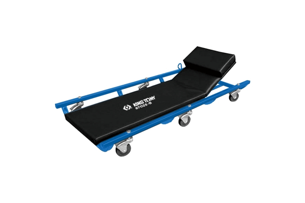 Подкатной лежак с подъемным подголовником KING TONY 87C25-B используется в автомастерских для ремонта и обслуживания автомобилей. Модель имеет стальной каркас с мягким основанием, что говорит о надежности конструкции и удобстве ее использования. 6 поворотных колес позволяют мастеру быстро перемещаться по рабочей зоне.