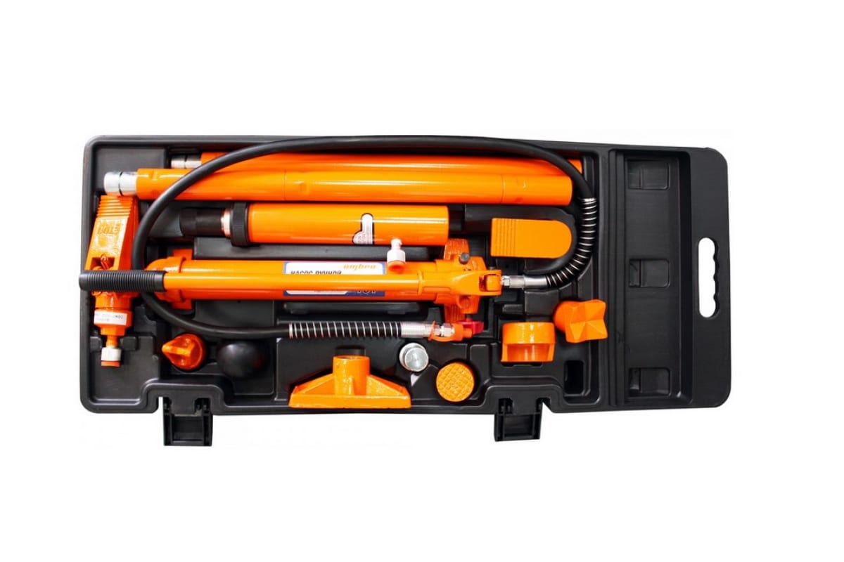 Набор гидравлического инструмента для кузовного ремонта Ombra OHT918M 10 т 17 предметов 55520 включает в себя гидравлический нанос, цилиндры, удлинители, а также фигурные насадки. Приспособления позволяют восстановить геометрию кузова автомобиля. Набор используется профессионалами в автомастерских или на СТО.