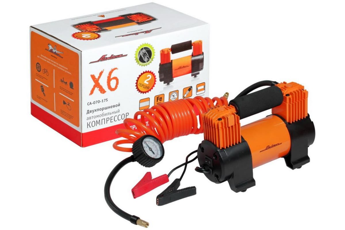 Двухпоршневой компрессор Airline STANDARD X6 CA-070-17S (70л/мин, 10 АТМ) подключается к клеммам аккумулятора. Оснащается встроенным манометром для визуального контроля давления. Модель имеет оптимальную длину кабеля питания - 3 метра. Шланг для накачивания имеет форму спирали, что делает его более компактным и в то же время он отлично растягивается до оптимальной длины без необходимости перемещать компрессор.