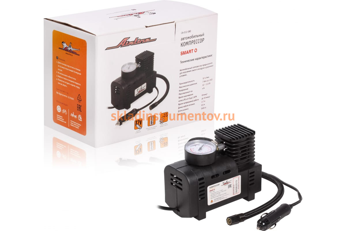 Компрессор в пластиковом корпусе Airline SMART O CA-012-08O представляет собой компактное устройство для накачивания шин размером до R15 (для накачивания колеса R14 до внутреннего давления 2 атм требуется период времени 8 минут). Удлиненная конструкция цилиндра и поршня способствует значительной производительности модели - 12 л/мин. Размер агрегата позволяет перевозить его в бардачке. Компрессор обеспечивает нагнетание давления в шинах в пределах 7 атм.