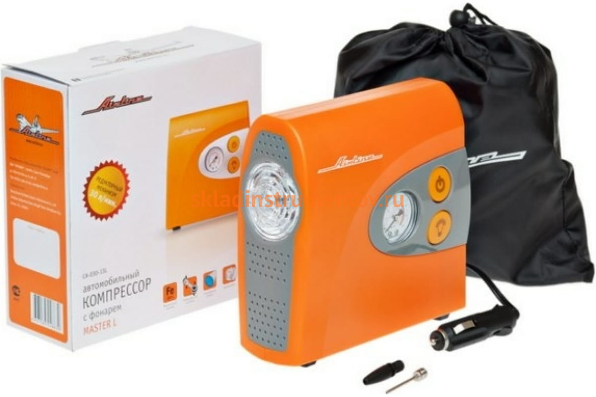 Компрессор в пластиковом корпусе + фонарь Airline MASTER L CA-030-13L оснащается светодиодным фонарем, встроенным манометром, редукторным механизмом и плавающим шатуном для удобной и эффективной эксплуатации. Пластиковый корпус агрегата не восприимчив к образованию коррозии, а также существенно облегчает конструкцию. Модель отличается стабильностью в работе. Время непрерывной эксплуатации компрессора составляет 15 минут. 3 минут достаточно для накачивания колеса типа R14 от 0 атм до 2 атм. Максимальное давление накачки - 8 атм.