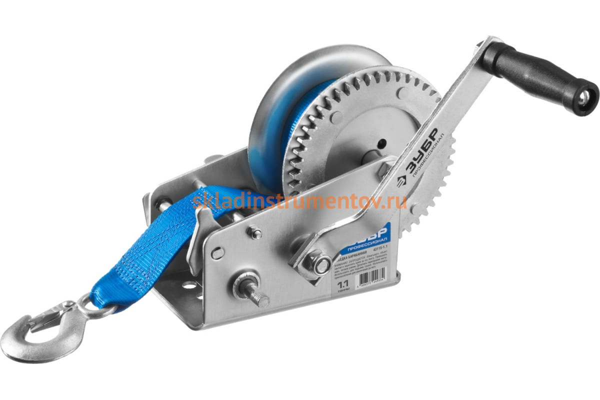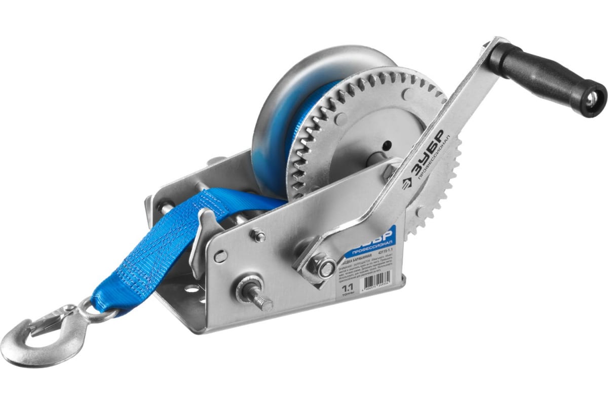 Ручная барабанная лебедка Зубр ПРОФЕССИОНАЛ ленточная 1,1т 10м 43115-1.1 - это оборудование для закрепления и перемещения грузов весом до 1.1 тонны. Конструкция оснащена барабаном, рукояткой, ленточным тросом и крюком из закаленной углеродистой стали. Трос изготовлен из прочного нейлона.