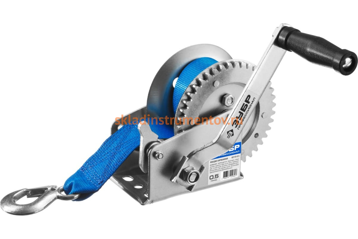 Ручная барабанная лебедка Зубр ПРОФЕССИОНАЛ ленточная 0,5т 8м 43115-0.5 - это инструмент для перемещения грузов в горизонтальном положении. Оборудование подойдет для использования в строительных и ремонтных работах. Корпус оснащен барабаном, на который при помощи рукоятки наматывается ленточный трос. Крюк выполнен из закаленной углеродистой стали.