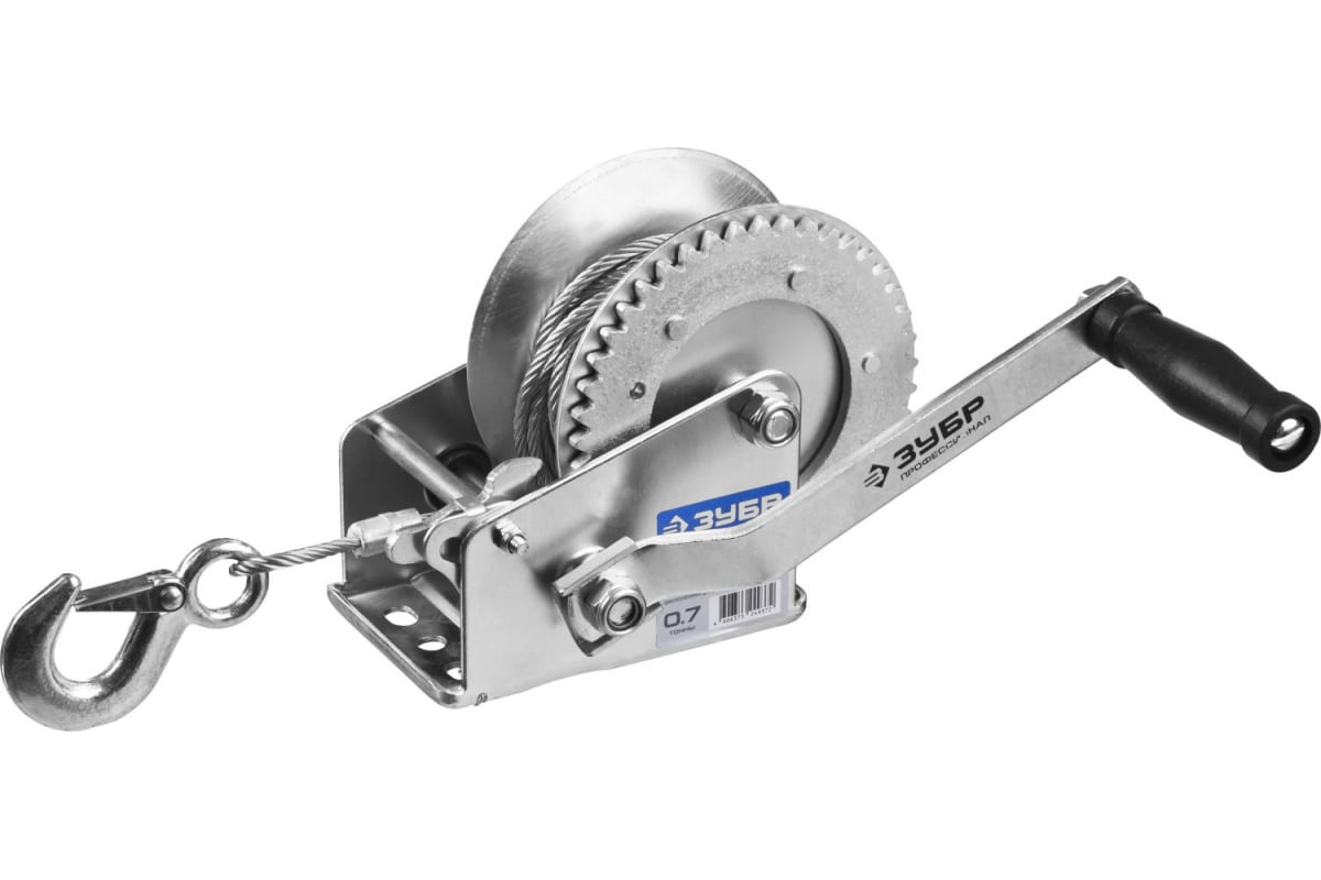 Ручная барабанная лебедка Зубр ПРОФЕССИОНАЛ тросовая 0,7т 8м 43113-0.7_z01 - это простое и удобное в использовании приспособление для перемещения грузов весом до 0,7 тонны. Ручной механизм с помощью рукоятки приводит в движение барабан, на который наматывается стальной трос. Крюк изготовлен из закаленной углеродистой стали.
