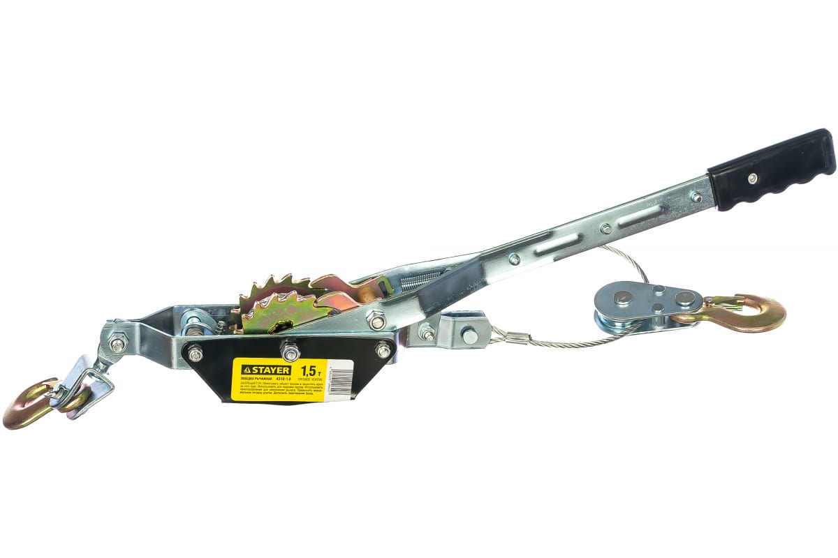 Автомобильная лебедка STAYER 1,5т / 2,4м 4310-1.5 - работает с максимальным наклоном в 15 градусов. Лебедка является рычажной. Это незаменимая вещь для владельцев внедорожников. Она способна тянуть груз в горизонтальной и наклонной плоскостях. Длина троса лебедки 2.4 м. Тяговое усилие - максимум 1.5т.
