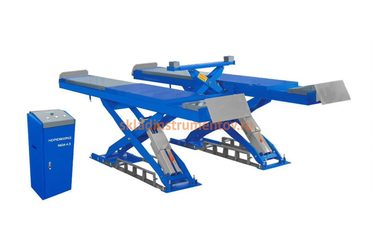 Ножничный подъемник для сход-развала, 4.5т NORDBERG N634-4.5 380 - прочная и надежная модель для обслуживания автомобилей. Оборудование широко применяется на СТО или автомастерских. Специальная конструкция позволяет легко и удобно получить доступ к узлам автомобиля. В случае аварийного отключения электроэнергии трапы платформы отпускаются механическим путем. Время подъема транспорта составляет всего 55 секунд.