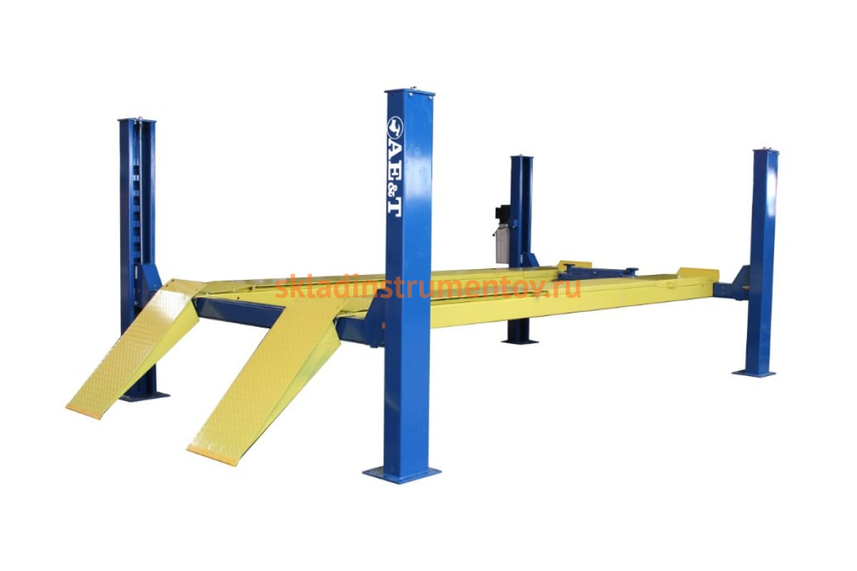 4-х стоечный подъемник для сход-развала с траверсой 380В AE&T F5.5-4 используется в небольших автосервисах для технического обслуживания автотранспорта различного типа - легковых машин, микроавтобусов и вэнов. Модель оснащается 4 самоблокирующимися замками, которые располагаются в каждой из стоек. Подъем осуществляется за счет работы мощного гидроцилиндра, который располагается под трапом. Стальные тросы отличаются высоким уровнем прочности. Длина платформ равняется 5160 мм, ширина - 508 мм. Расстояние между трапами составляет 1078 мм. Ширина проезда - 2895 мм.