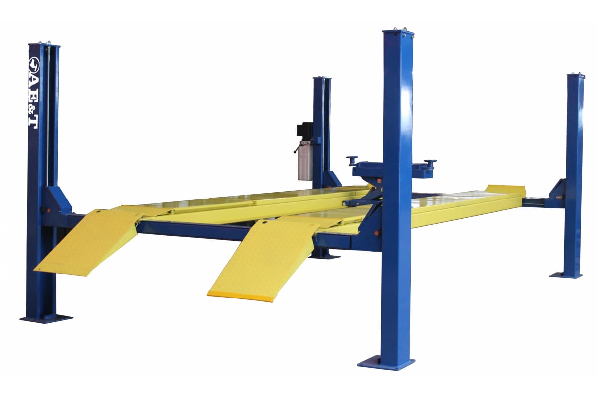 Электрогидравлический четырехстоечный подъемник 380 В AE&T F4.5D-4 служит для подъема автомобилей на необходимую высоту и результативного проведения работ на стенде "сход - развал". Четыре стойки и электрогидравлический привод обеспечивают надежность конструкции. Ширина и длина трапов дает возможность обслуживания как легковых автомобилей, так и небольших грузовиков. Внутреннее расстояние между трапами - 1000-1100 мм - позволяет производить работы с разной шириной колеи у машин. Электрогидравлическая двухточечная траверса обеспечивает быстрый подъем груза, который занимает до 50 секунд.