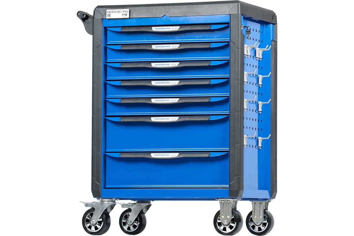 Тележка с системой защиты от опрокидывания NORDBERG T7P имеет пять больших и два малых ящика. Оснащена центральным замком. Благодаря поворотным колесам с тормозом тележку легко передвигать. Боковая стенка дополнена крючками. Поверхность крышки выполнена из ударопрочного и антискользящего пластика, а корпус усилен ребрами жесткости.