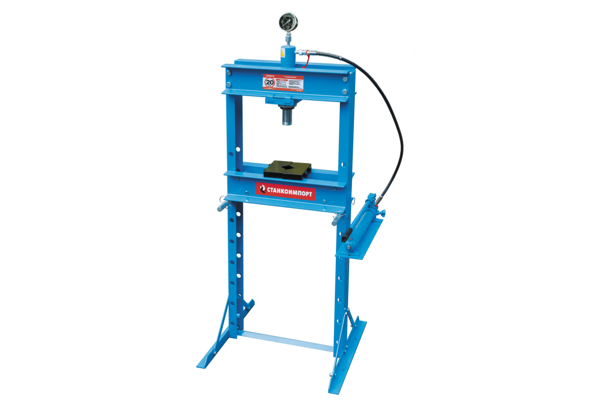Гаражный пресс Станкоимпорт на 20 тонн SD0804CE используют в автосервисах и на станциях технического обслуживания. Крепление оборудования производят к полу через монтажные отверстия. Усиленная рама обеспечивает надежность и прочность конструкции. Рабочий стол регулируется по высоте для обработки изделий разных размеров. Насос и цилиндр соединены между собой армированный шлангом.