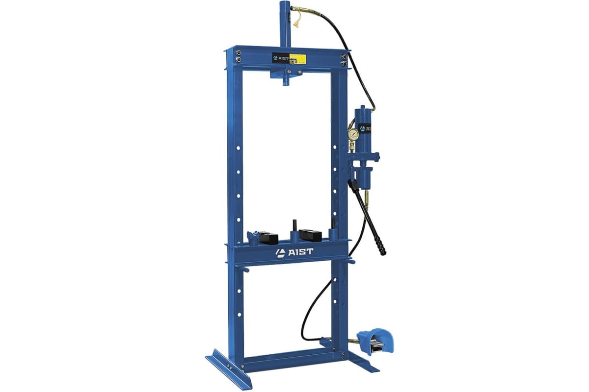 Пневмогидравлический пресс AIST 10т область работы 225-1065мм 00-00010669 развивает усилие прижима 10 тонн. Модель находит применение в промышленной сфере, а также в сфере ремонта и обслуживания автомобилей. Рабочий диапазон установки составляет 225-1065 мм с шагом 102 мм. Для контроля рабочего давления конструкция пресса включает в себя манометр с четкой и легко читаемой шкалой. Гидроцилиндр с выносным насосом пневмогидравлического типа гарантирует эффективность применения агрегата.