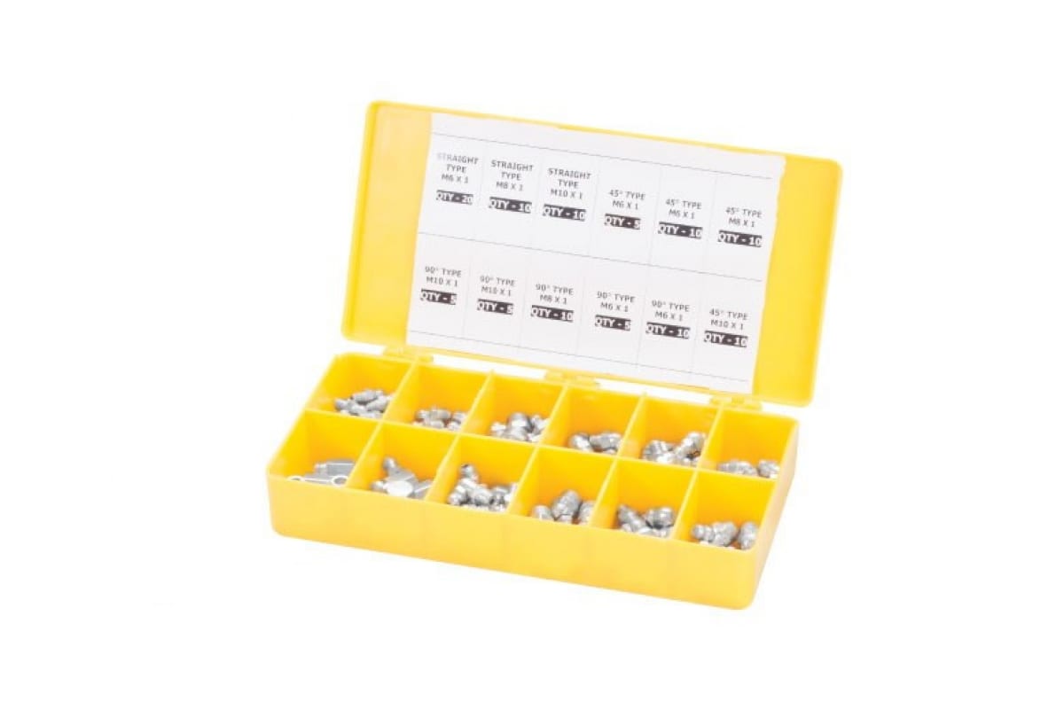 Комплект пресс-масленок в пластиковой коробке 110 шт М6 М8 М10 прямой 45 90 градусов GROZ GR43991