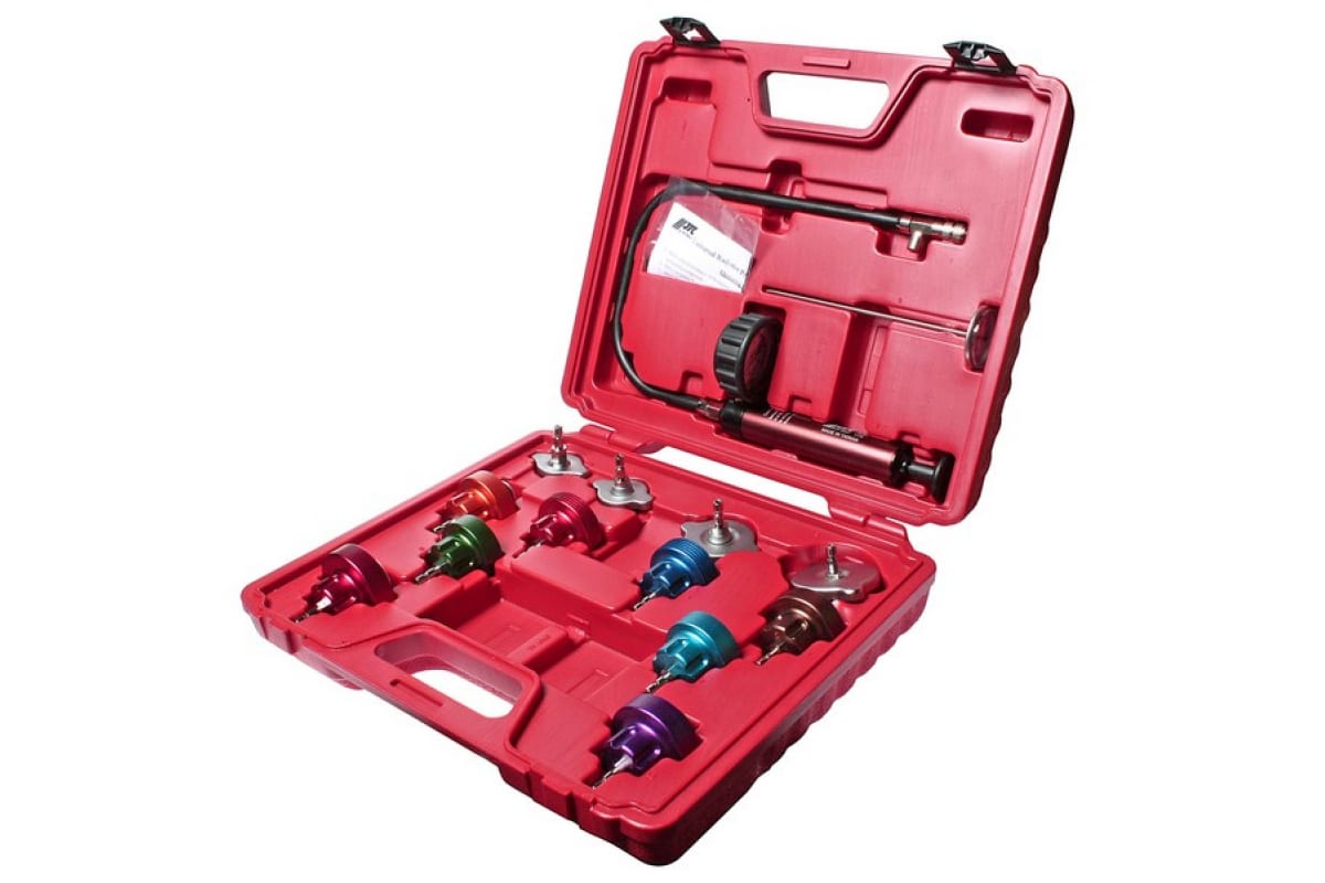 Набор для тестирования герметичности охладительной системы, 14 предметов JTC 1005 - это отличное решение при выборе диагностических приспособлений в небольшую автомастерскую или на станцию ТО. С помощью данной модели пользователь (как профессионал, так и любитель) сможет протестировать охладительную систему автомобиля на предмет пробоин и утечек. Комплект подойдет для большинства марок автомобилей. Поставляется в эргономичном пластиковом кейсе, характеризующимся высокой прочностью, оснащенном транспортировочной рукояткой и специальными замками-защелками.