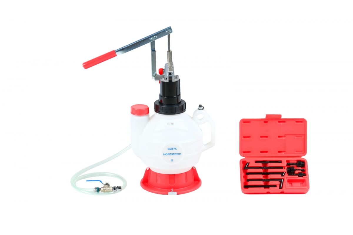 Установка для заливки масла в АКПП NORDBERG, ручная, с переходниками, 7,5 л N4007K предназначена для использования в автосервисах и на станциях технического обслуживания. Рассчитана для работы с маслом вязкостью до SAE 140. Расход - 75 см³/цикл.