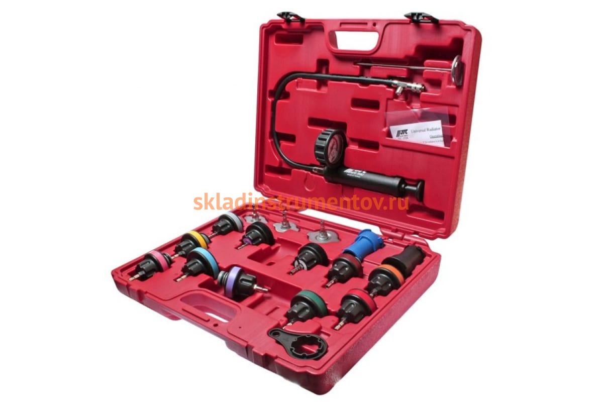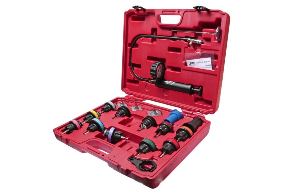 Прибор для проверки герметичности системы охлаждения JTC 1528 позволяет быстро и точно определить место утечки хладагентов. В комплект поставки входит 19 предметов, которые дают возможность проводить подобную диагностику в системах большинства существующих марок автомобилей.