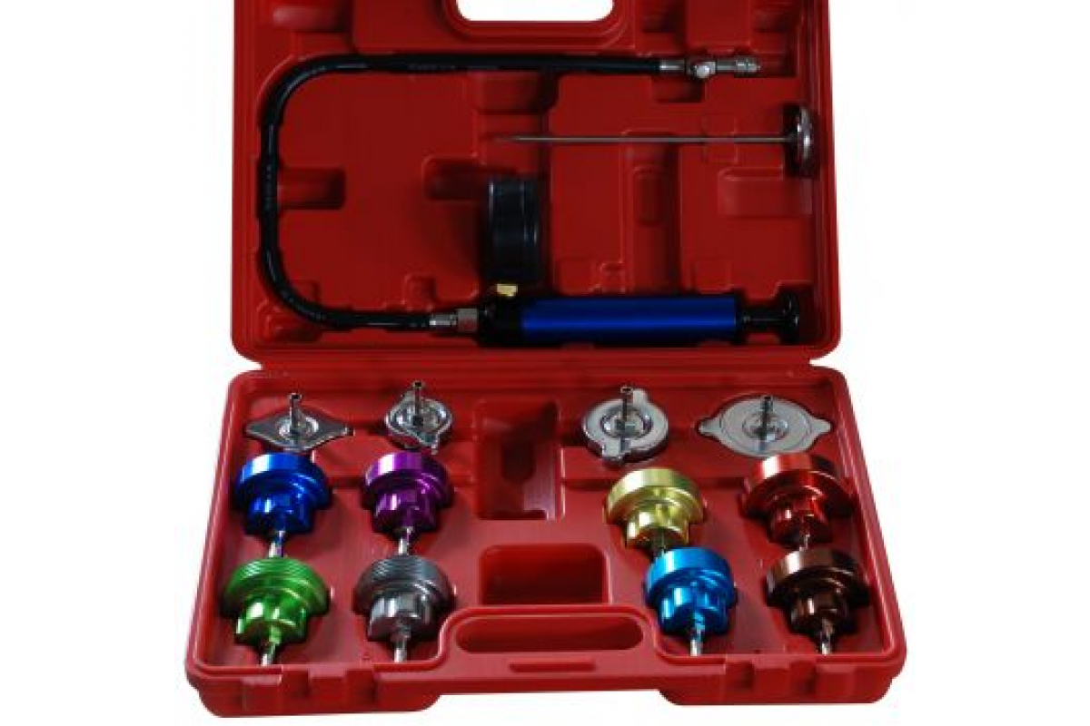 Опрессовка систем охлаждения 14 предметов AE&T TA-G1001 представляет собой удобный комплект, который включает в себя все необходимое для проверки состояния системы и обслуживания соединений.