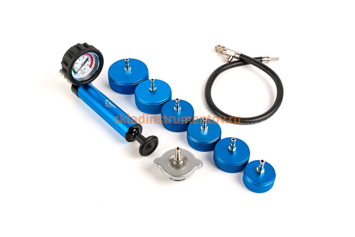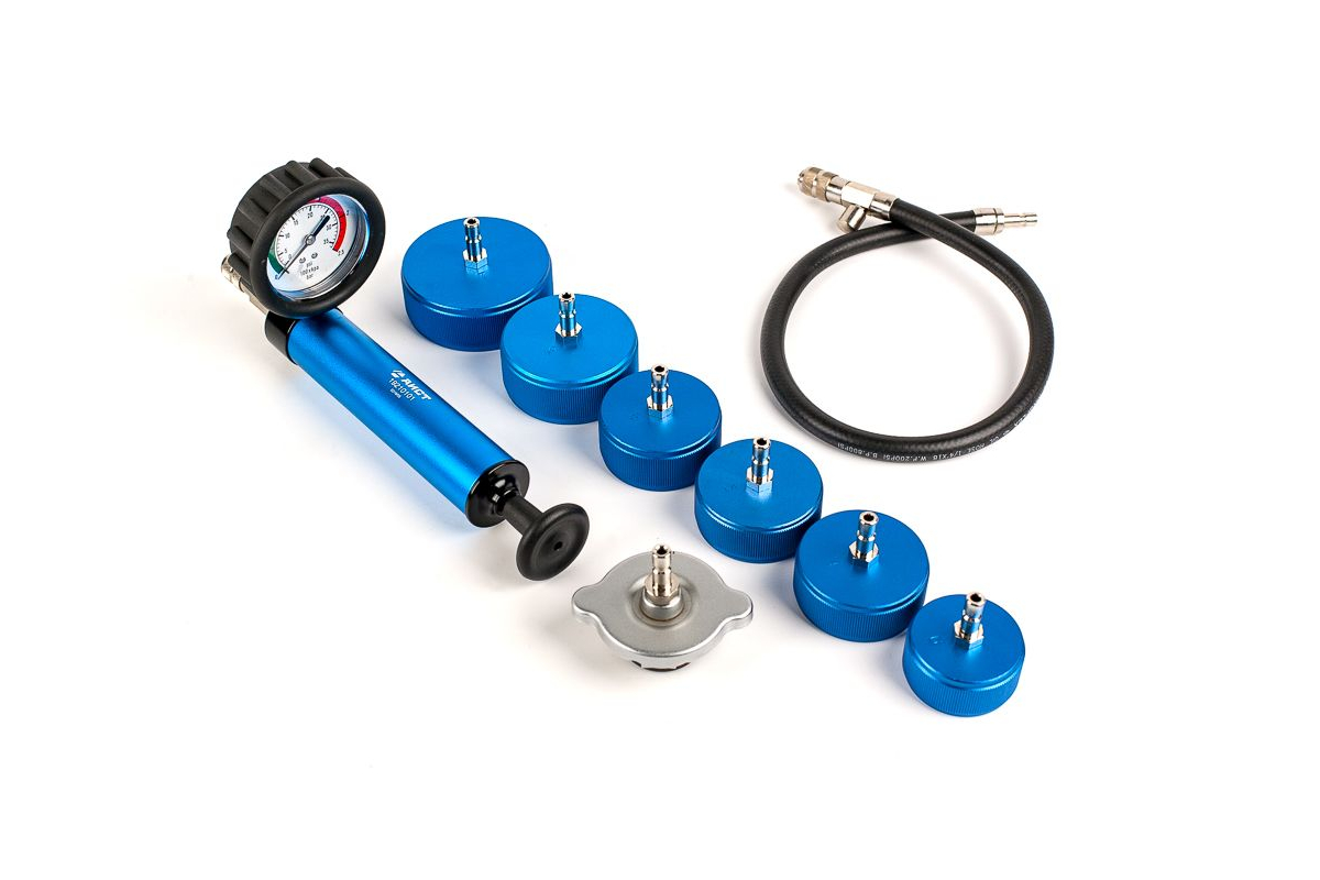 В набор входит 7 резьбовых адаптеров для подключения к горловине радиатора или расширительного бачка, а также ручной насос со шлангом с рабочим давлением до 2.5 Бар.