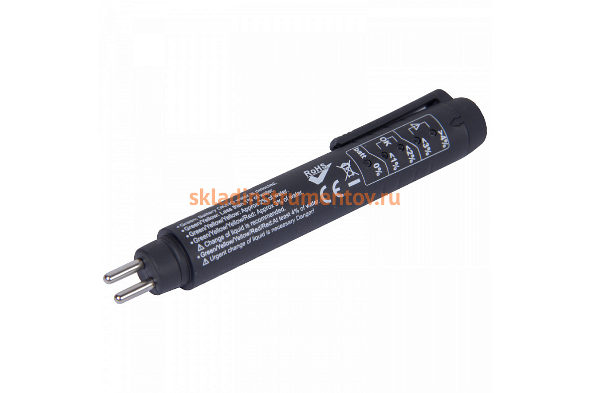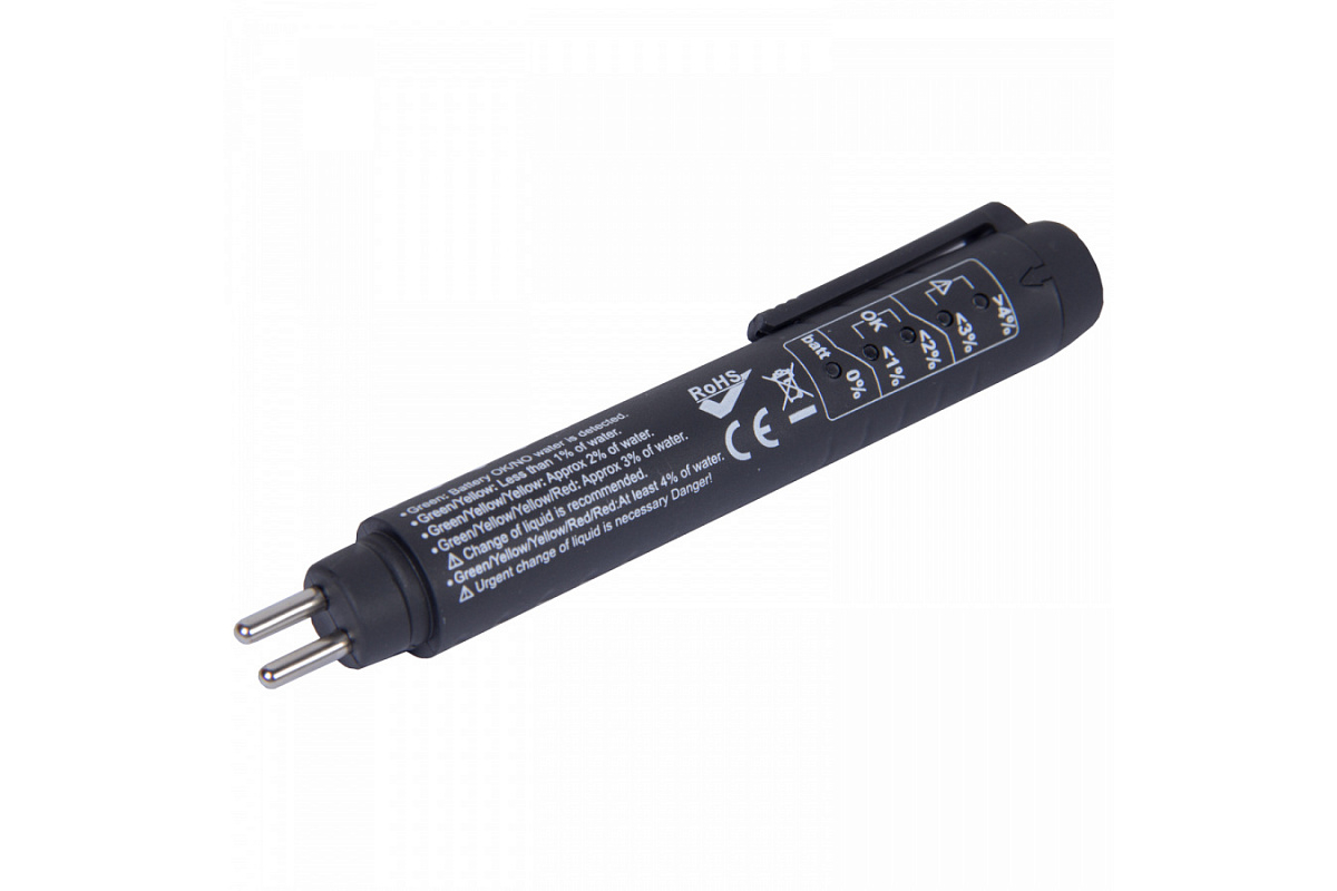 Тестер для определения качества тормозной жидкости МАСТАК 129-10250 предназначен для экспресс-проверки тормозной жидкости на наличие влаги. На приборе находится дискретная шкала из пяти светодиодных индикаторов, показывающих уровень содержания влаги: от 0 до 5 процентов. Показания более трёх считаются критическими, в таких случаях требуется полная замена тормозной жидкости. Подходящие типы тормозных жидкостей: DOT3, DOT4.